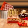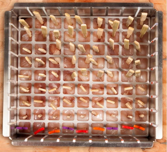 When filling is completed, place metal plate on the filling and insert skewers through the holes in the locking