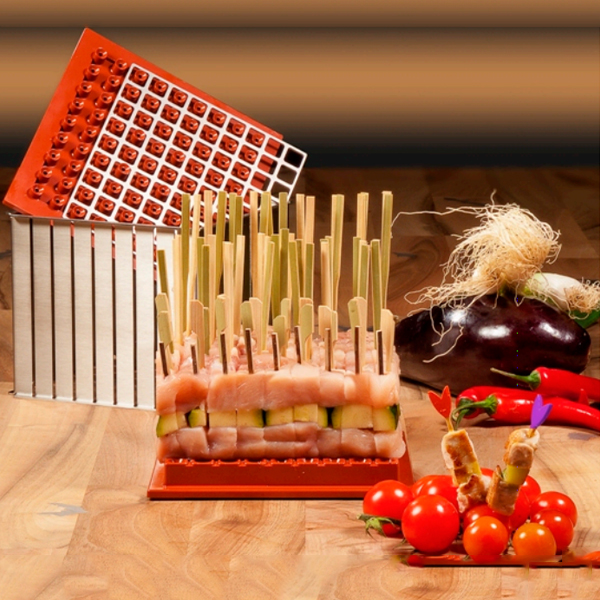 vegetables, cheese and fruits, as you fancy, depending on requested skewer length. Before skewering, please
