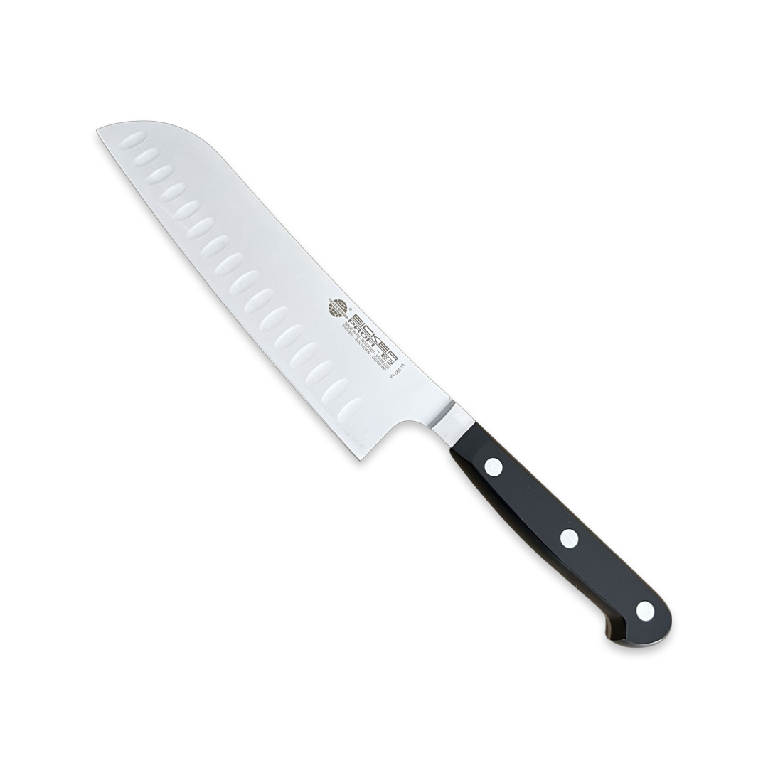 Dao Santoku 2455518 Eicker lưỡi dao dài 18cm, bản rộng 4.5cm sẽ khiến bạn bất ngờ với sự thuận tiện trong việc kiểm soát độ chính xác của các hoạt động cắt, thái, gọt sơ chế thịt thực phẩm trong không gian bếp chuyên nghiệp/gia đình. Các điểm tiếp xúc an toàn trên đầu của lưỡi dao giúp bạn chuyển động mượt hơn trong quá trình cắt, thái và gọt vỏ. Lưỡi dao được làm từ thép độc quyền của Eicker Đức cho chất lượng cao, chống rỉ, chống bản rính, kháng khuẩn, bền đẹp, không bị xỉn màu và dễ dàng được làm sạch sau khi sử dụng. Phần chuôi/cán dao thiết kế đẹp tinh tế thời trang được làm từ nhựa POM cao cấp nhất, thiết kế bền đẹp đảm bảo an toàn vệ sịch thực phẩm không lo ảnh hưởng đến sức khỏe gia đình thân yêu của bạn.